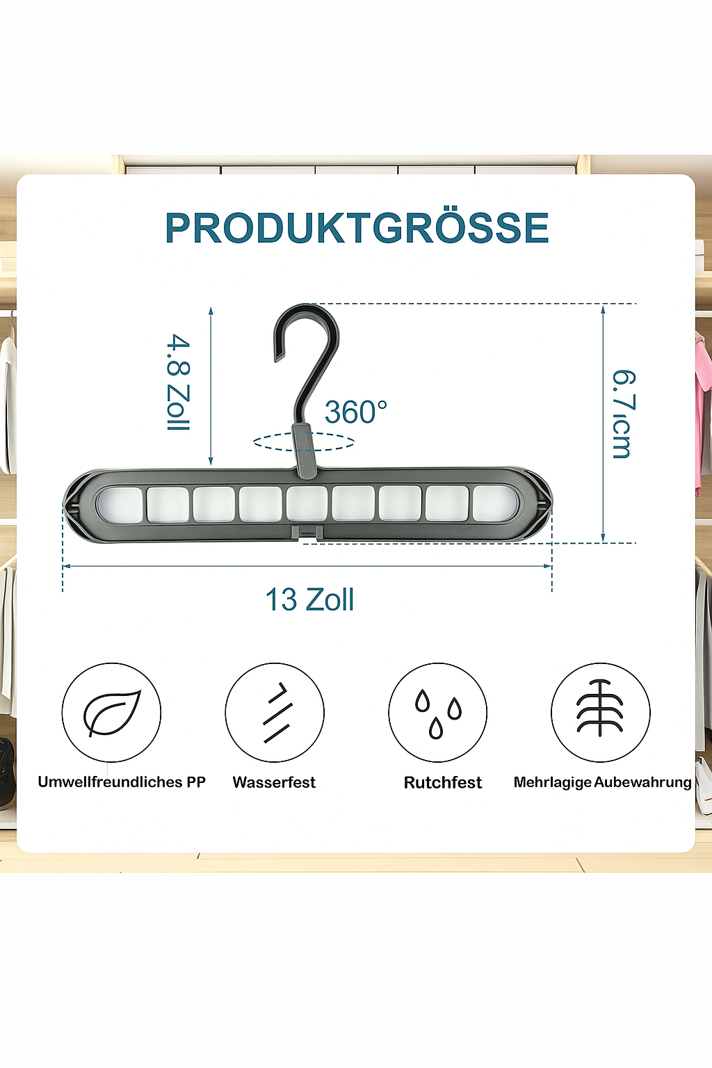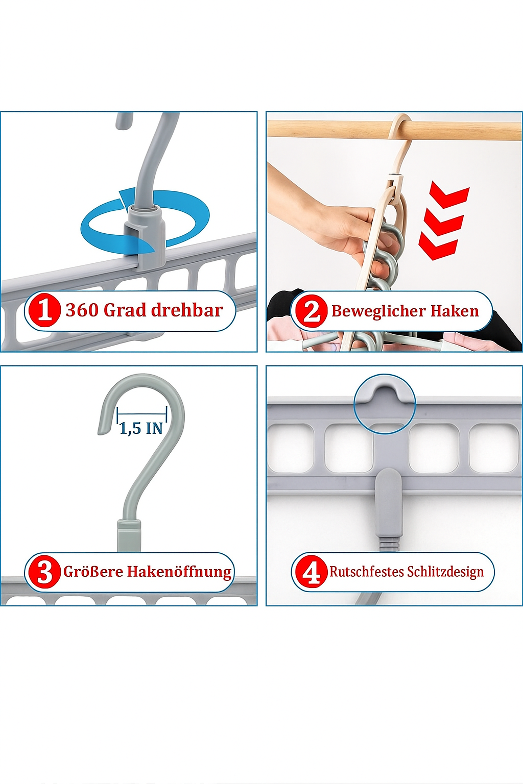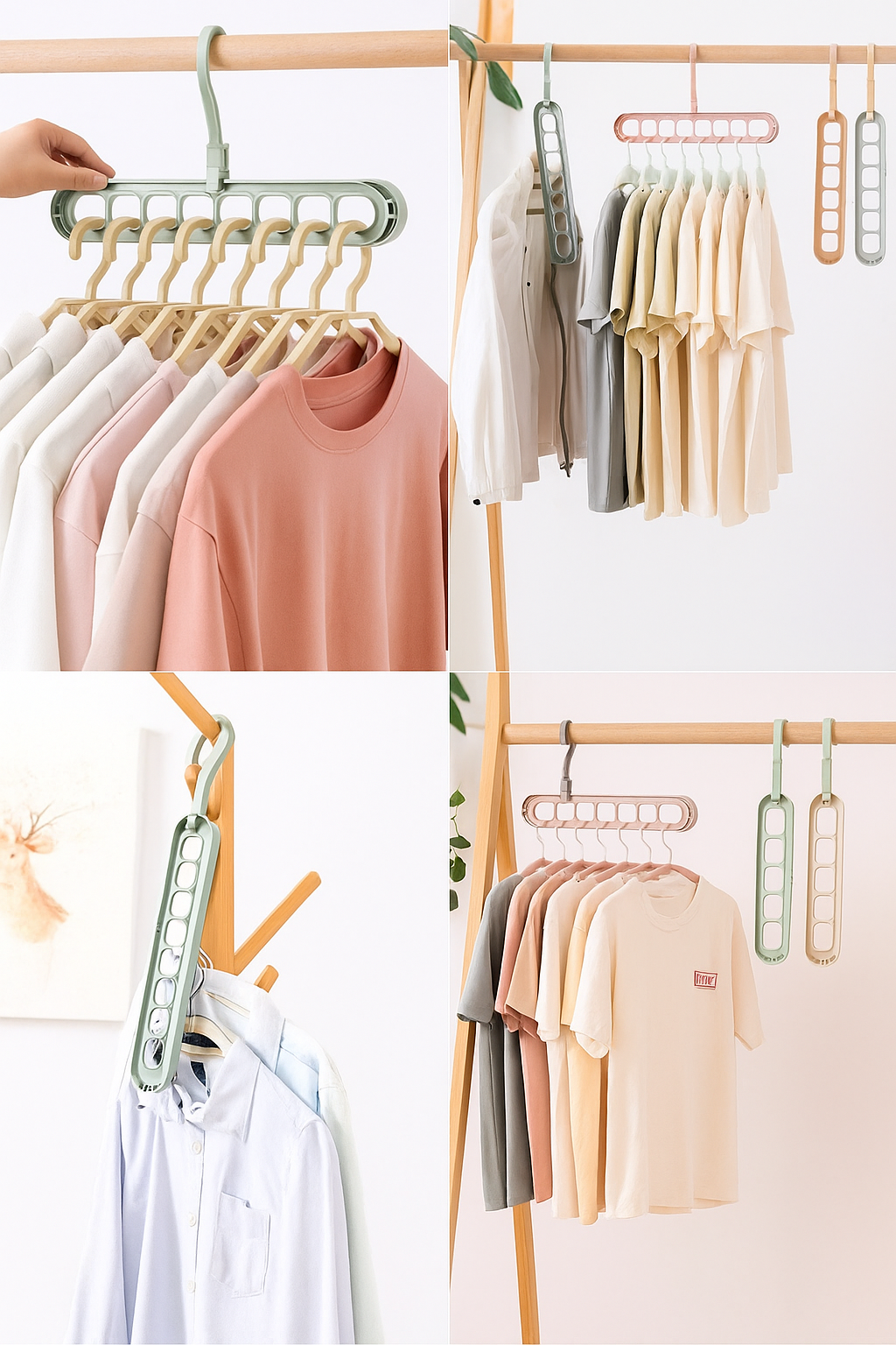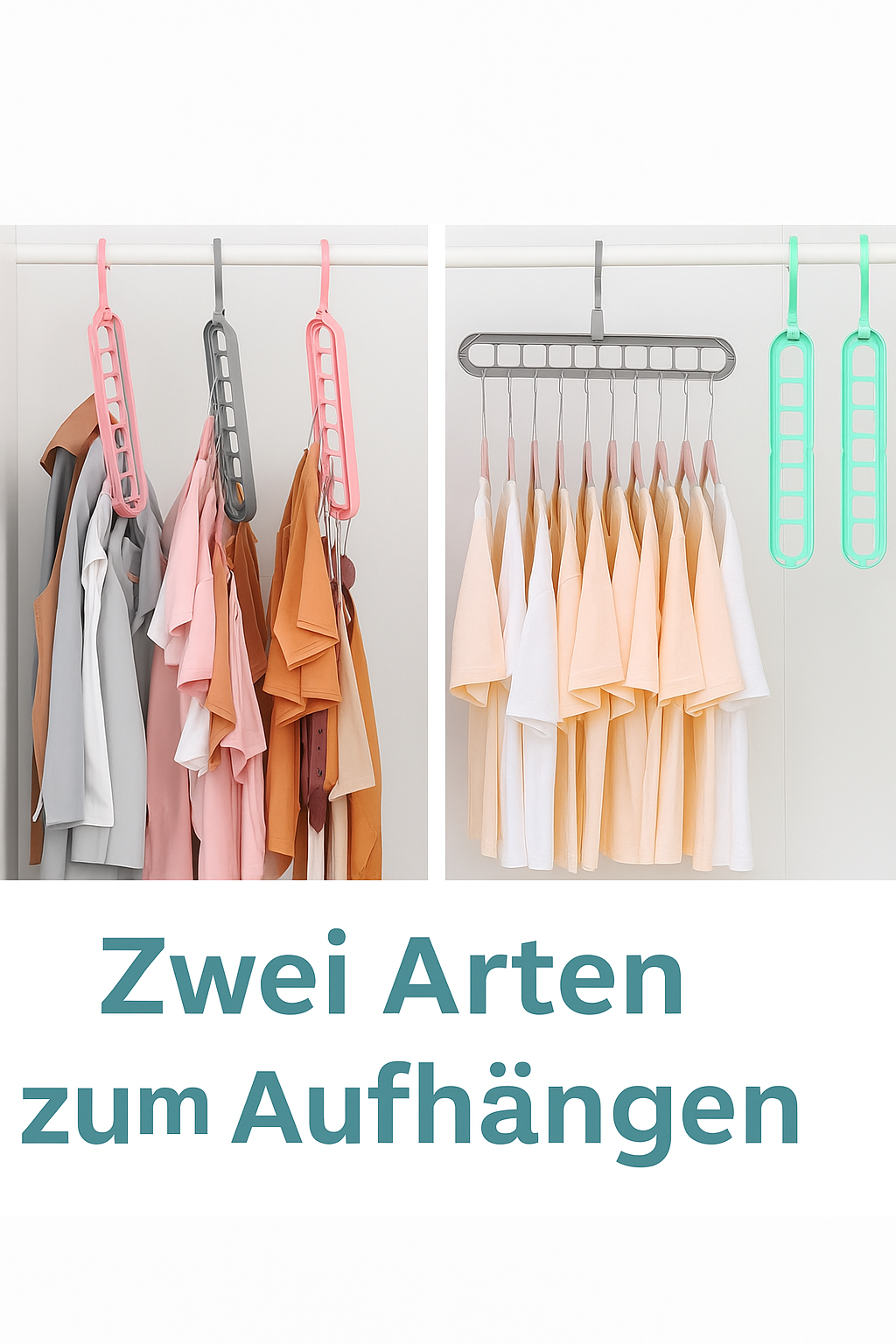 Unser platzsparender Multi-Kleiderbügel mit 9 Aufhängeschlitzen bringt sofort mehr Struktur und Platz in deinen Alltag – egal ob für Hemden, T-Shirts, Blusen oder Hosen.